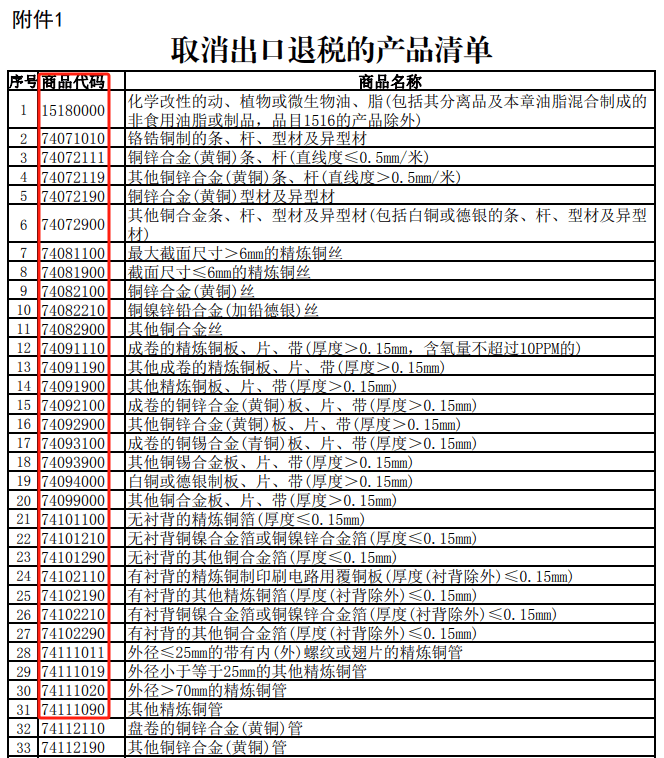 一是:打消不产产物的出口退税,包罗化学改性的动、动物或微生物油、铜锌合金丝等产物。二是:将部门产物的出口退税率由13%下调至9%,好比成本油、光伏,电池、部门非金属矿物成品。三是:该通知布告自2024年12月1日起实施。总共包含59个产物,好比精辟铜管、铜板,其他铜合金条等,根基都是金属材料一类。