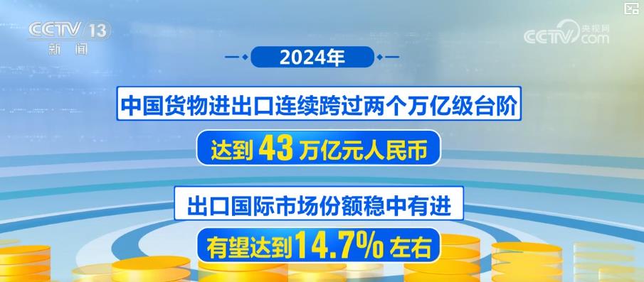 2024年,中国货色进出口持续跨过两个万亿级台阶,达到43万亿元人平易近币。出口国际市场份额稳中有进,无望达到14。7%摆布。有进出话柄绩的企业近70万家,此中平易近营企业占比跨越八成。同时,“立异”成为中国外贸的明显底色,通过智能化、数字化、绿色化的持续转型升级,中国新业态的潜力仍正在持续,“鼠标一点,买卖全球”,跨境电商为全球消费者创制了更为便当的购物体验,也支持其持续数年实现两位数增加。