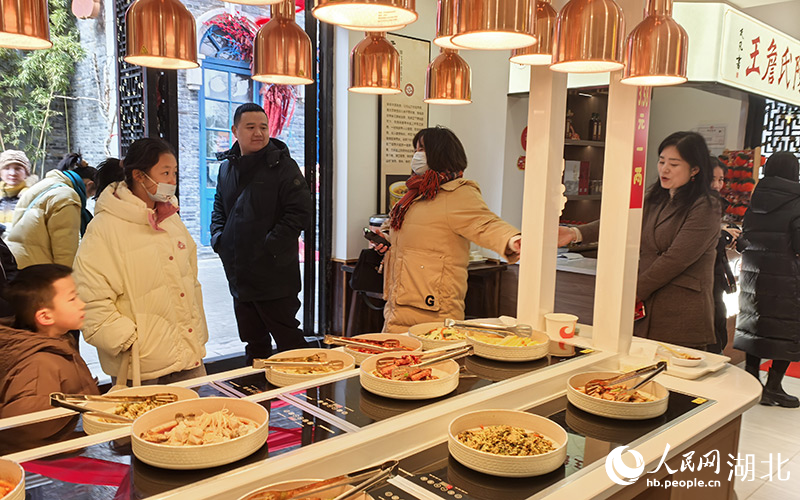 走进汉口里街区,红灯笼高高挂起,出色纷呈的风俗表演以及琳琅满目标美食摊位让人目不暇接。正午时分,不少旅客走进新开的詹王厨艺·非遗美食传承体验馆品尝广水美食。