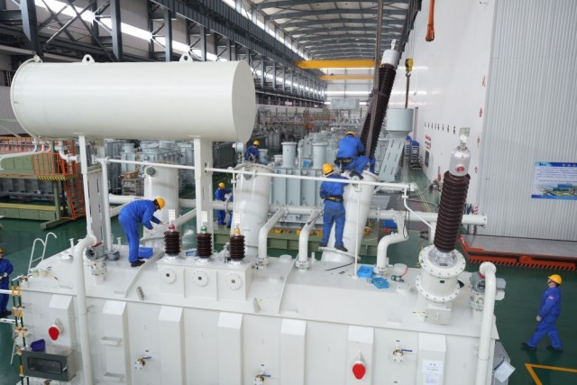 4月1日,正在浙江白云浙变电气设备无限公司,工做人员正在厂房拆卸22万伏特高压油浸式变压器。该公司输变电设备出口全球,一季度产值达2。2亿元。记者 翁忻旸 摄。