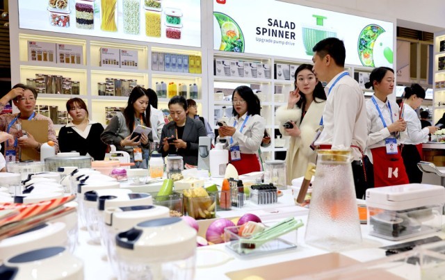 3月1日,第33届华东进出口商品买卖会正在上海揭幕。图为人们正在第33届华交会一处家庭用品展位交换。记者 方喆 摄?。
